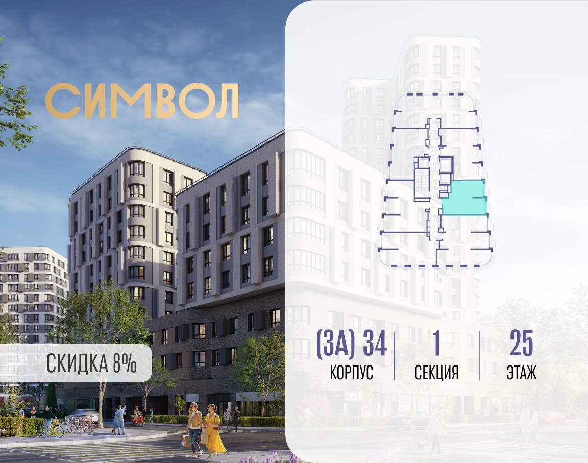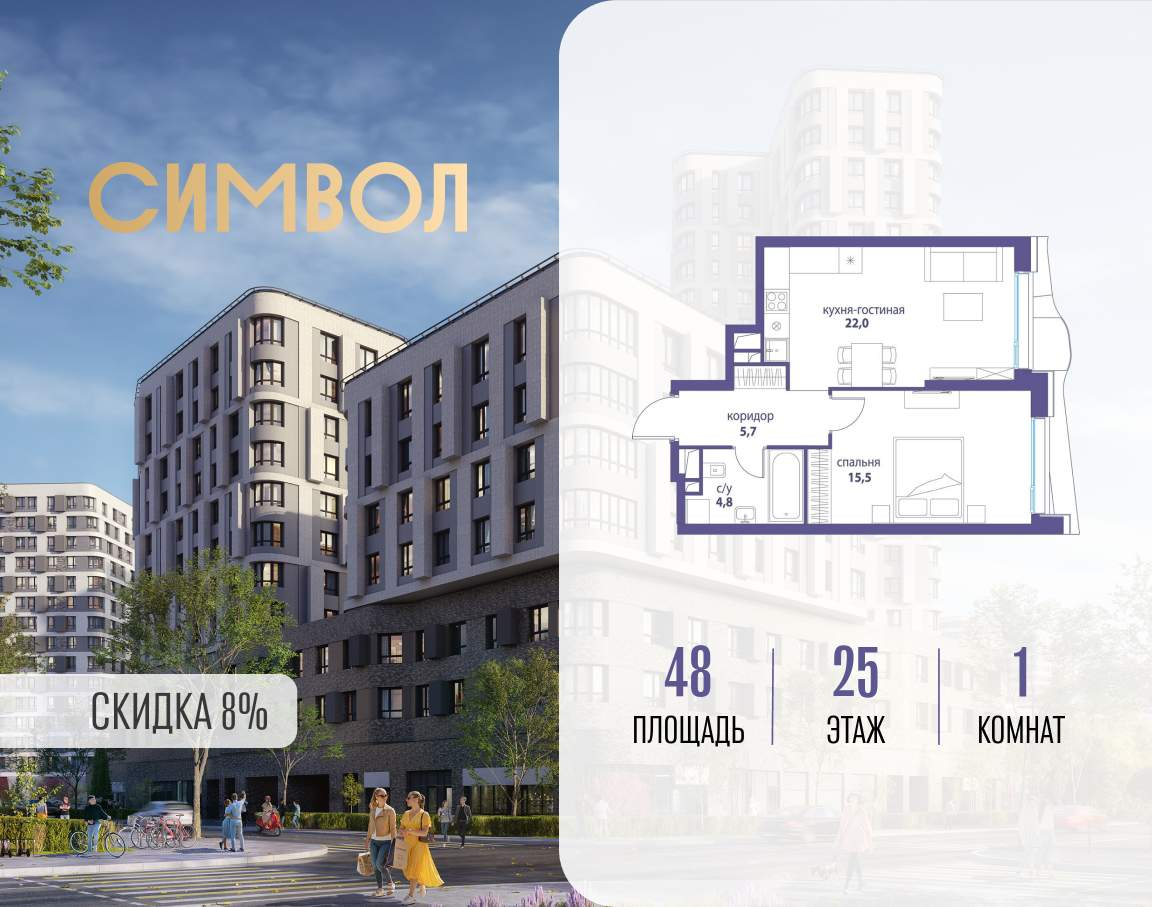 Продается 1-комнатная квартира от застройщика: общая площадь 48.00 м, жилая 15.50 м, кухня 22.00 м, 25-й этаж, жилой квартал «Вдохновение», корпус 34 (секция 1) . Срок сдачи: 4 квартал 2027 года.