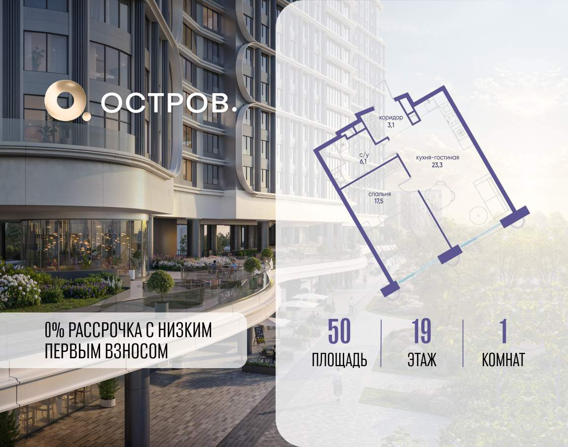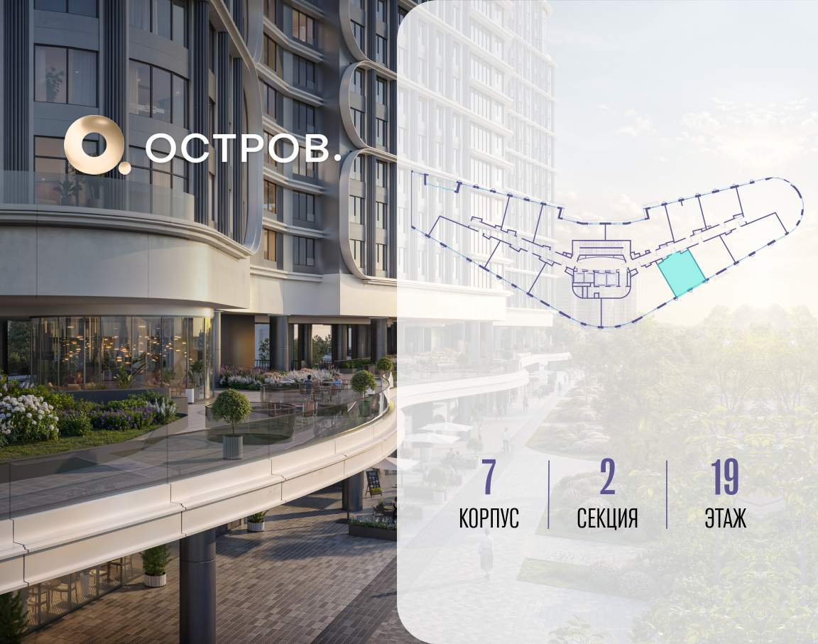 Продаётся 1-комн. квартира от застройщика: общая площадь 50.00 м, жилая 17.50 м, кухня 23.30 м, 19-й этаж, жилой квартал «Остров 7», корпус 7 (секция 2) . Срок сдачи: 3 квартал 2028 года.