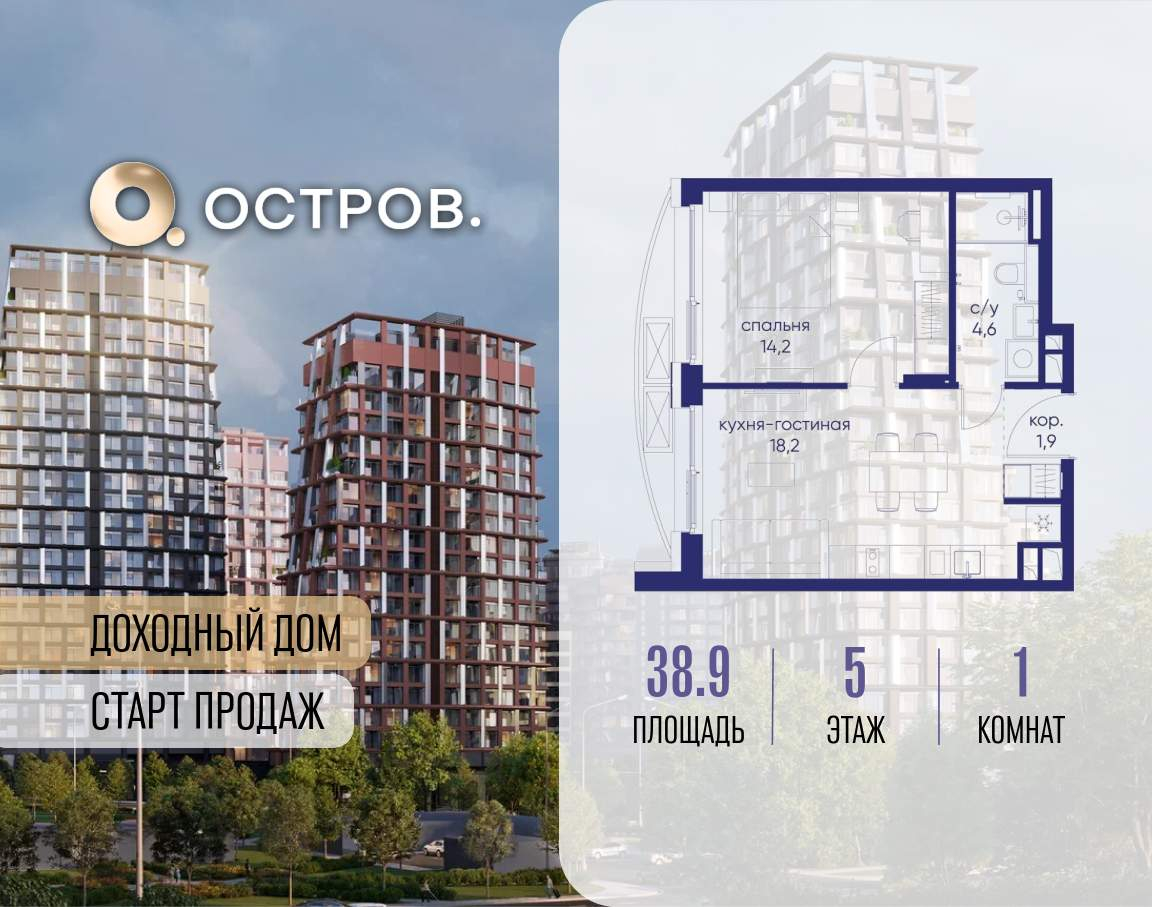 Продаётся 1-комн. квартира от застройщика: общая площадь 38.90 м, жилая 14.20 м, кухня 18.20 м, 5-й этаж, жилой квартал «Остров 14», корпус 1 (секция 2) . Срок сдачи: 2 квартал 2029 года.