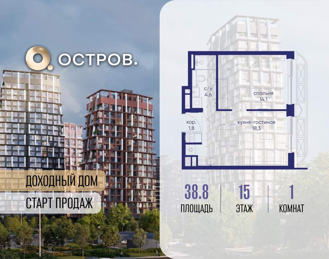 Продаётся 1-комн. квартира от застройщика: общая площадь 38.80 м, жилая 14.10 м, кухня 18.30 м, 15-й этаж, жилой квартал «Остров 14», корпус 1 (секция 2) . Срок сдачи: 2 квартал 2029 года.