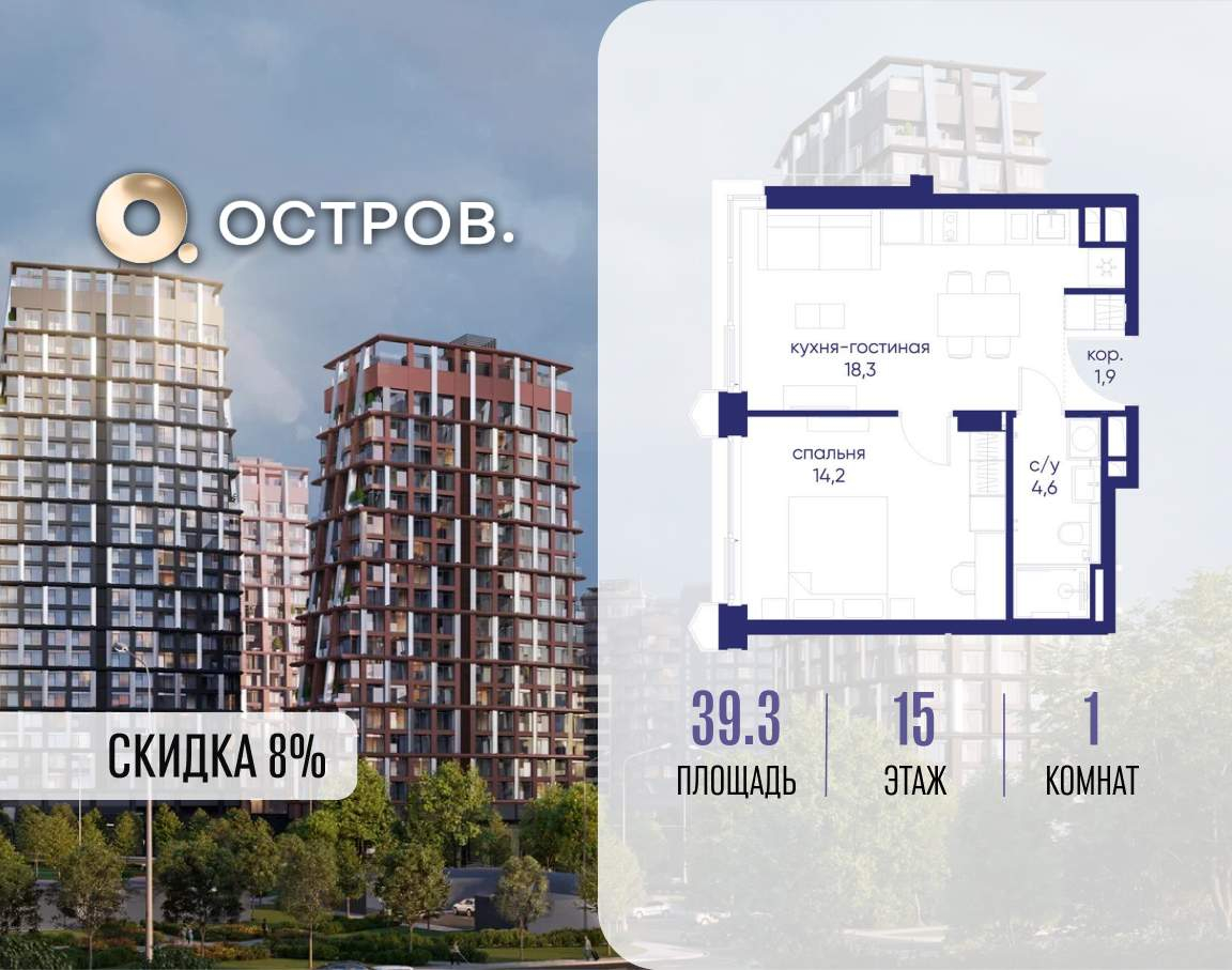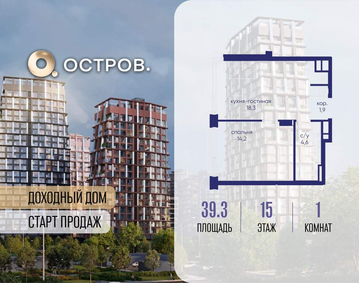 Продаётся 1-комн. квартира от застройщика: общая площадь 39.30 м, жилая 14.20 м, кухня 18.70 м, 15-й этаж, жилой квартал «Остров 14», корпус 1 (секция 2) . Срок сдачи: 2 квартал 2029 года.