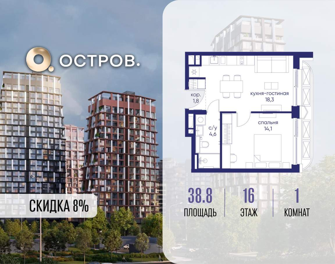 Продаётся 1-комн. квартира от застройщика: общая площадь 38.80 м, жилая 14.10 м, кухня 18.30 м, 16-й этаж, жилой квартал «Остров 14», корпус 1 (секция 2) . Срок сдачи: 2 квартал 2029 года.