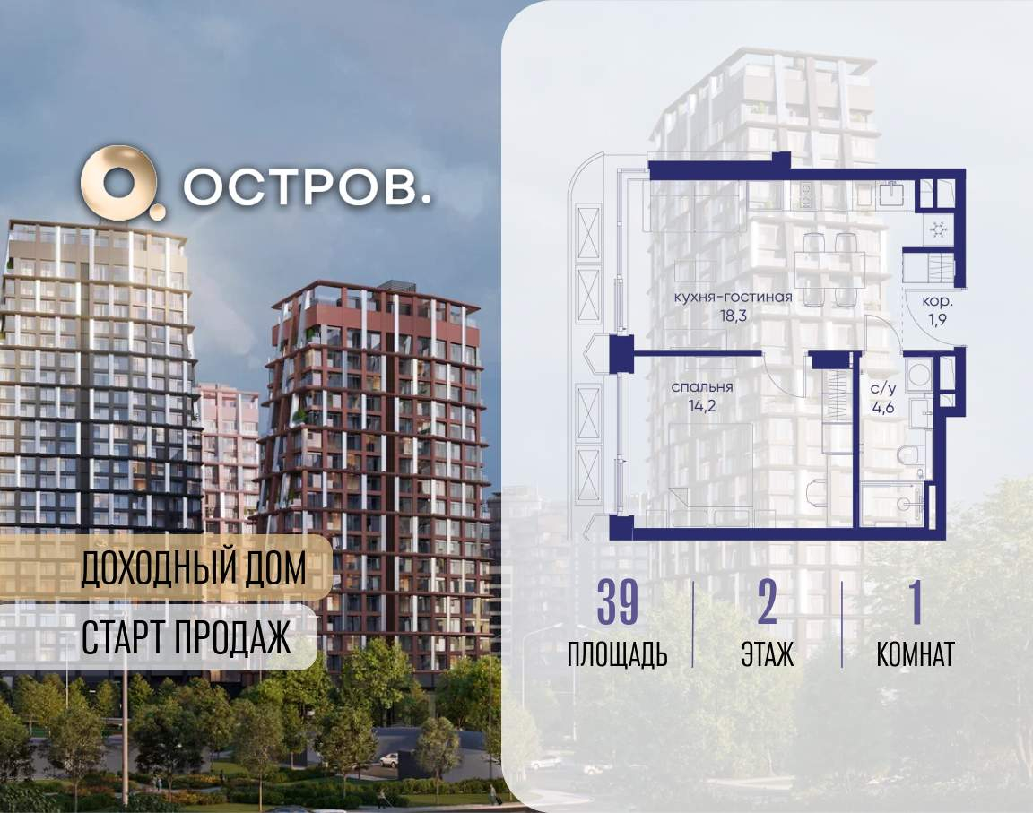 Продаётся 1-комн. квартира от застройщика: общая площадь 39.00 м, жилая 14.20 м, кухня 18.30 м, 2-й этаж, жилой квартал «Остров 14», корпус 1 (секция 2) . Срок сдачи: 2 квартал 2029 года.