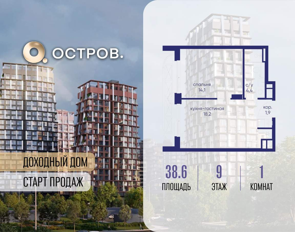 Продаётся 1-комн. квартира от застройщика: общая площадь 38.60 м, жилая 14.10 м, кухня 18.20 м, 9-й этаж, жилой квартал «Остров 14», корпус 1 (секция 2) . Срок сдачи: 2 квартал 2029 года.