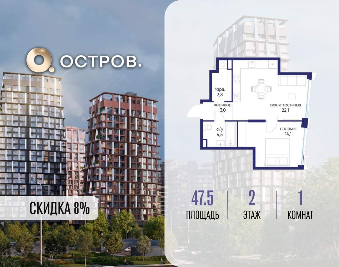 Продаётся 1-комн. квартира от застройщика: общая площадь 47.50 м, жилая 14.10 м, кухня 22.10 м, 2-й этаж, жилой квартал «Остров 14», корпус 6 (секция 1) . Срок сдачи: 2 квартал 2029 года.