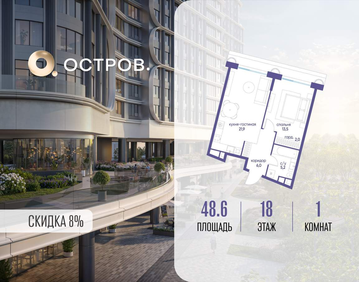 ОСТРОВ от Донстрой - жилой комплекс на западе Москвы, в Мневниковской пойме. Уникальное преимущество комплекса - в том, что он обособлен от города рекой и природным парком (650 га) . Благодаря природному окружению эта территория имеет лучший экологический рейтинг в столице. Кварталы ОСТРОВА объединены ландшафтным дизайном в единое пространство - с набережными и Центральным бульваром. На ОСТРОВЕ любые объекты, необходимые для полноценной жизни и отдыха, находятся на расстоянии 15-минутной прогулки. Торговый центр и супермаркеты, кафе и рестораны, фитнес, салоны красоты, школы и детские сады. А также крупнейший в Москве спортивный кластер.