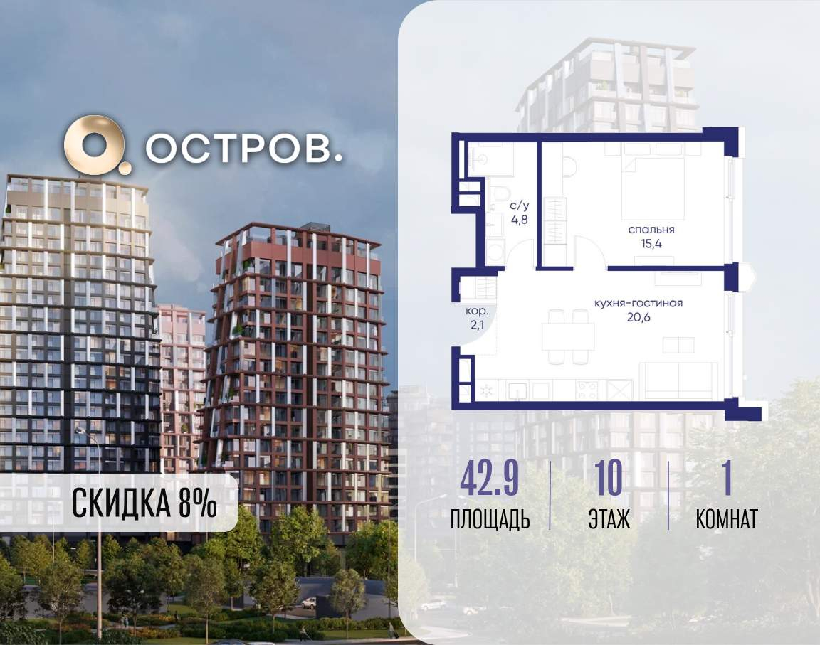 Продаётся 1-комн. квартира от застройщика: общая площадь 42.90 м, жилая 15.40 м, кухня 20.60 м, 10-й этаж, жилой квартал «Остров 14», корпус 1 (секция 1) . Срок сдачи: 2 квартал 2029 года.