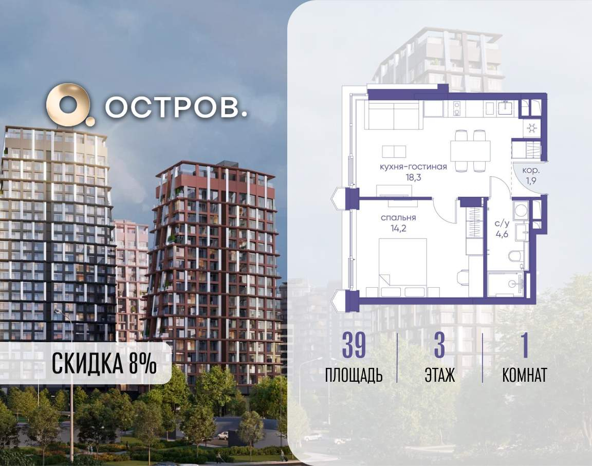 Продаётся 1-комн. квартира от застройщика: общая площадь 39.00 м, жилая 14.20 м, кухня 18.30 м, 3-й этаж, жилой квартал «Остров 14», корпус 1 (секция 2) . Срок сдачи: 2 квартал 2029 года.