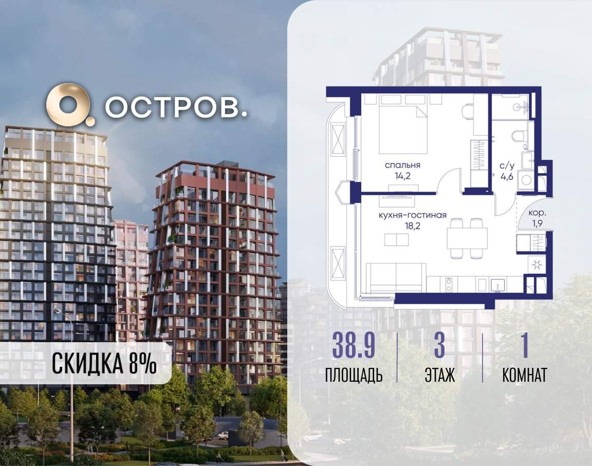 Продаётся 1-комн. квартира от застройщика: общая площадь 38.90 м, жилая 0.00 м, кухня 18.20 м, 3-й этаж, жилой квартал «Остров 14», корпус 1 (секция 1) . Срок сдачи: 2 квартал 2029 года.