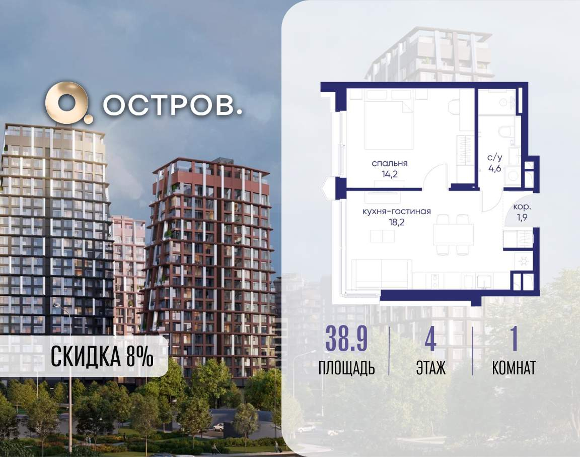 Продаётся 1-комн. квартира от застройщика: общая площадь 38.90 м, жилая 14.20 м, кухня 18.20 м, 4-й этаж, жилой квартал «Остров 14», корпус 1 (секция 1) . Срок сдачи: 2 квартал 2029 года.