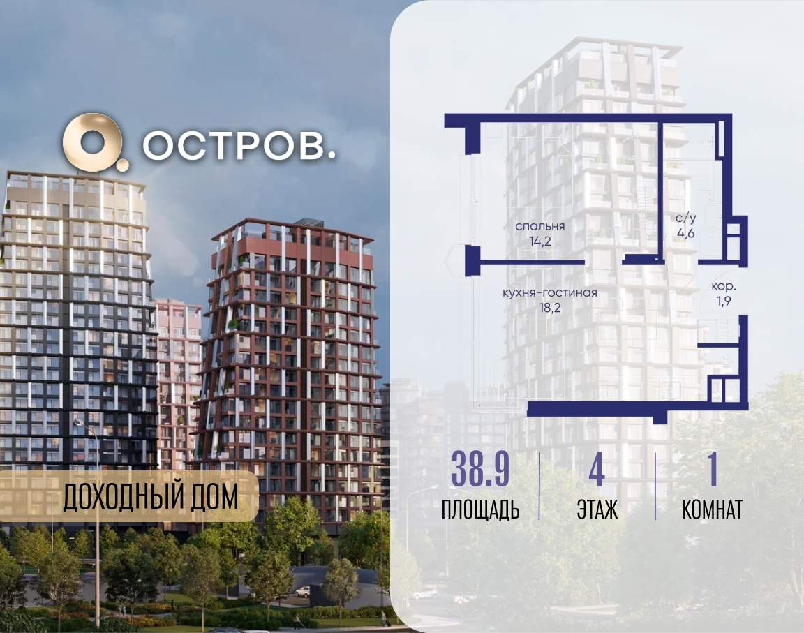 Продаётся 1-комн. квартира от застройщика: общая площадь 38.90 м, жилая 14.20 м, кухня 18.20 м, 4-й этаж, жилой квартал «Остров 14», корпус 1 (секция 1) . Срок сдачи: 2 квартал 2029 года.