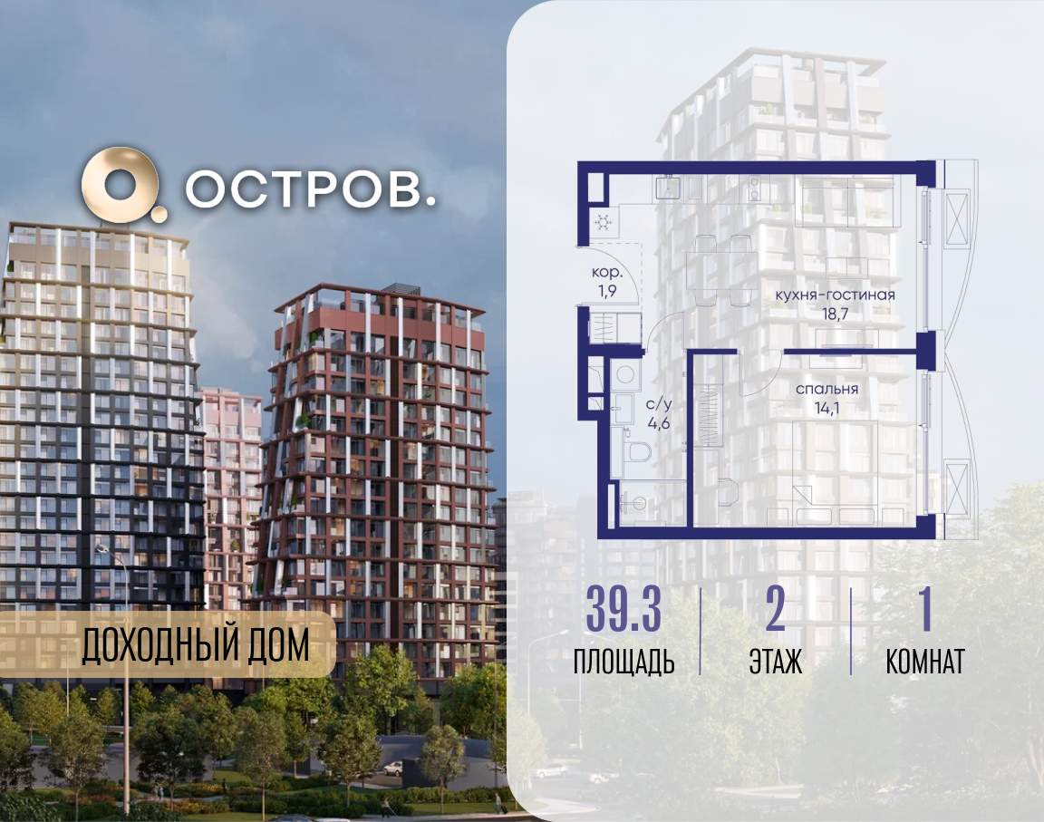 Продаётся 1-комн. квартира от застройщика: общая площадь 39.30 м, жилая 14.10 м, кухня 18.70 м, 2-й этаж, жилой квартал «Остров 14», корпус 1 (секция 1) . Срок сдачи: 2 квартал 2029 года.
