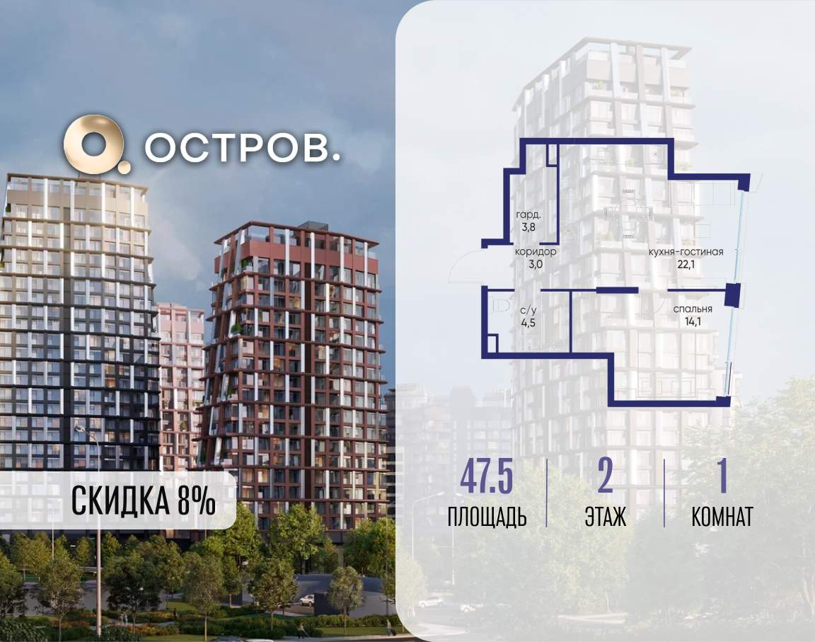 Продаётся 1-комн. квартира от застройщика: общая площадь 47.50 м, жилая 14.10 м, кухня 22.10 м, 2-й этаж, жилой квартал «Остров 14», корпус 6 (секция 1) . Срок сдачи: 2 квартал 2029 года.