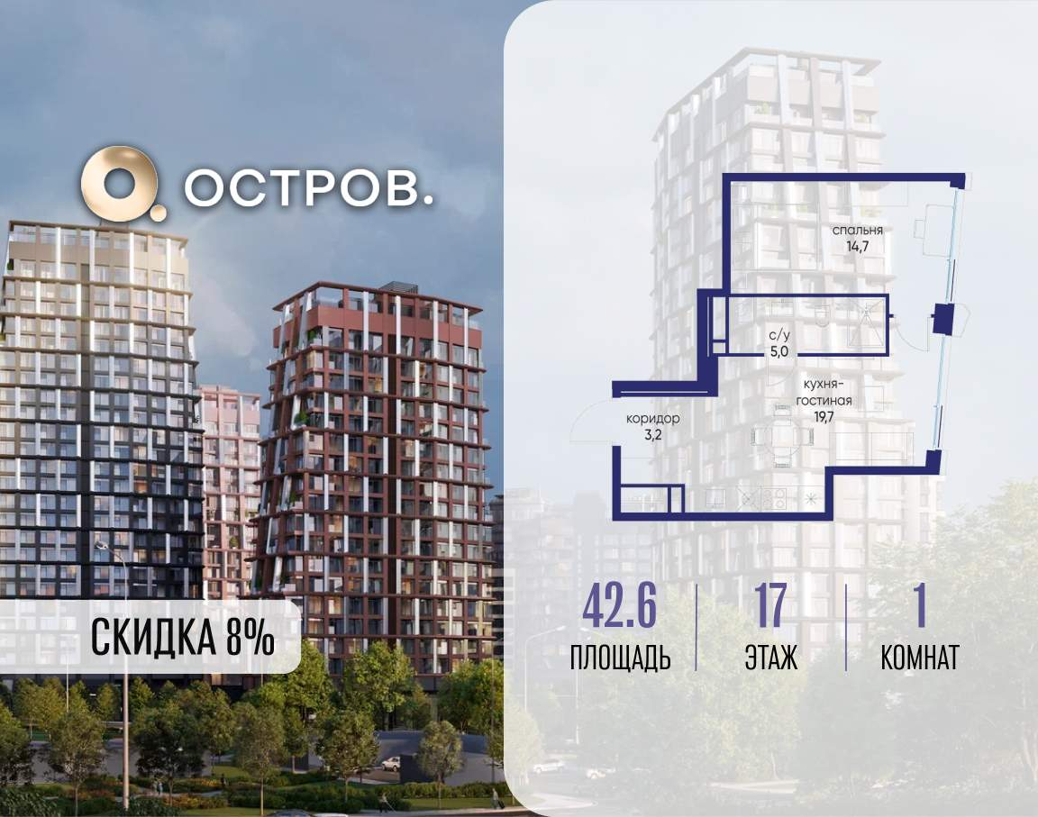 Продаётся 1-комн. квартира от застройщика: общая площадь 42.60 м, жилая 14.70 м, кухня 19.70 м, 17-й этаж, жилой квартал «Остров 14», корпус 6 (секция 1) . Срок сдачи: 2 квартал 2029 года.