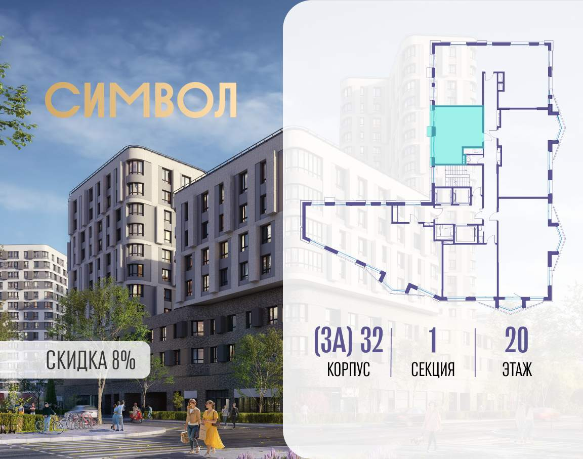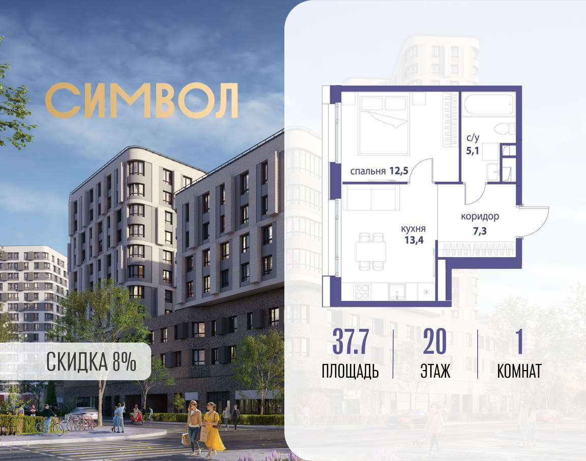 Продается 1-комнатная квартира от застройщика: общая площадь 37.70 м, жилая 12.50 м, кухня 13.40 м, 20-й этаж, жилой квартал «Вдохновение», корпус 32 (секция 1) . Срок сдачи: 4 квартал 2027 года.
