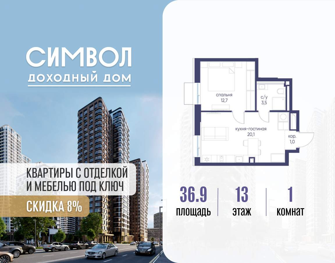 Продается 1-комнатная квартира от застройщика: общая площадь 36.90 м, жилая 14.10 м, кухня 15.60 м, 13-й этаж, жилой квартал «Гордость», корпус 40 (секция 1) . Срок сдачи: 2 квартал 2029 года.
