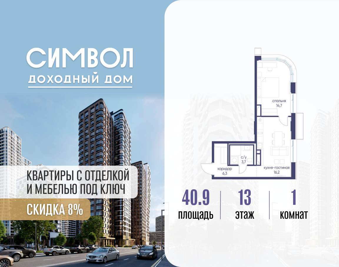 Продается 1-комнатная квартира от застройщика: общая площадь 40.90 м, жилая 14.70 м, кухня 16.20 м, 13-й этаж, жилой квартал «Гордость», корпус 40 (секция 1) . Срок сдачи: 2 квартал 2029 года.