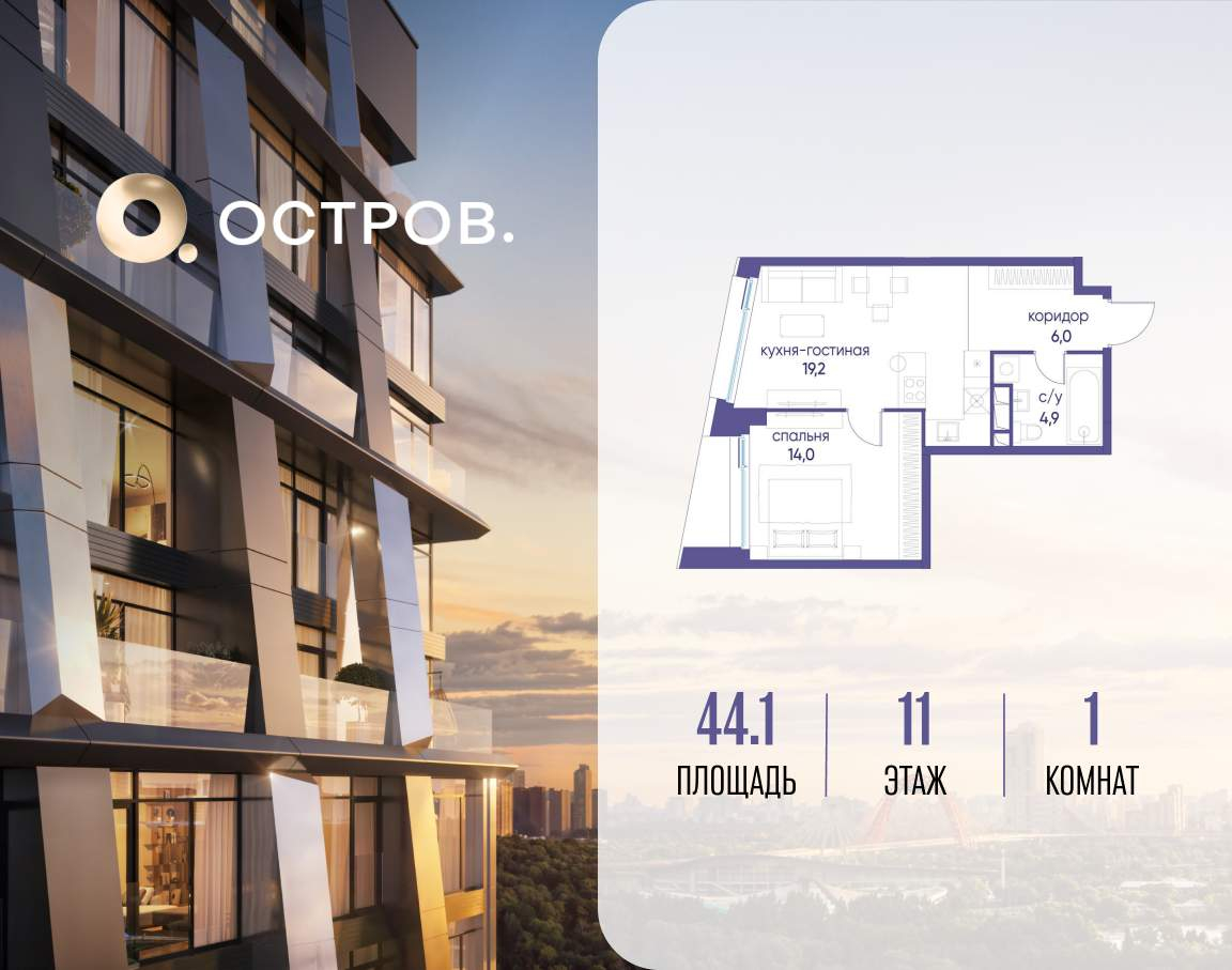 Продаётся 1-комн. квартира от застройщика: общая площадь 44.10 м, жилая 14.00 м, кухня 19.20 м, 11-й этаж, жилой квартал «Остров 12», корпус 1 (секция 2) . Срок сдачи: 1 квартал 2029 года.