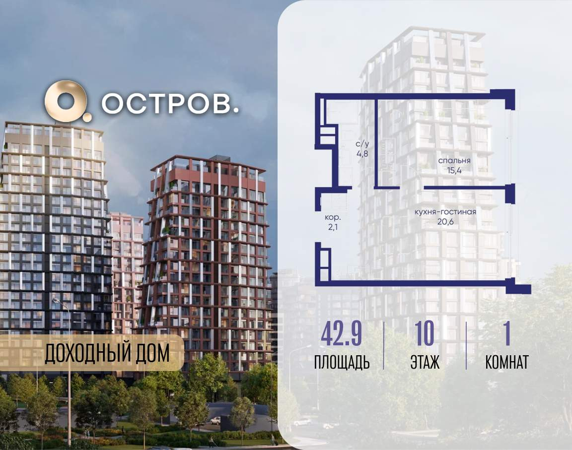 Продаётся 1-комн. квартира от застройщика: общая площадь 42.90 м, жилая 15.40 м, кухня 20.60 м, 10-й этаж, жилой квартал «Остров 14», корпус 1 (секция 1) . Срок сдачи: 2 квартал 2029 года.