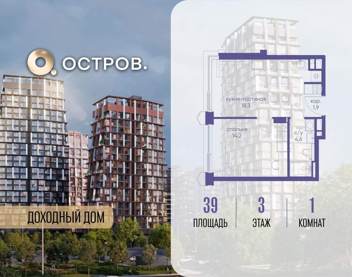 Продаётся 1-комн. квартира от застройщика: общая площадь 39.00 м, жилая 14.20 м, кухня 18.30 м, 3-й этаж, жилой квартал «Остров 14», корпус 1 (секция 2) . Срок сдачи: 2 квартал 2029 года.