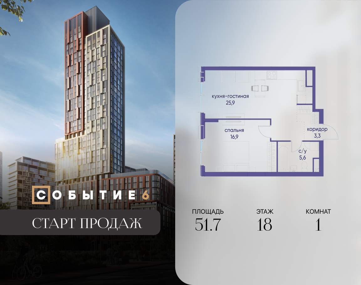 Продаётся 1-комнатная квартира от застройщика: общая площадь 51.70 м, жилая 16.90 м, кухня 25.90 м, 18-й этаж, жилой квартал «Событие-6», корпус 2 (секция 1) Срок сдачи: 1 квартал 2029 года.