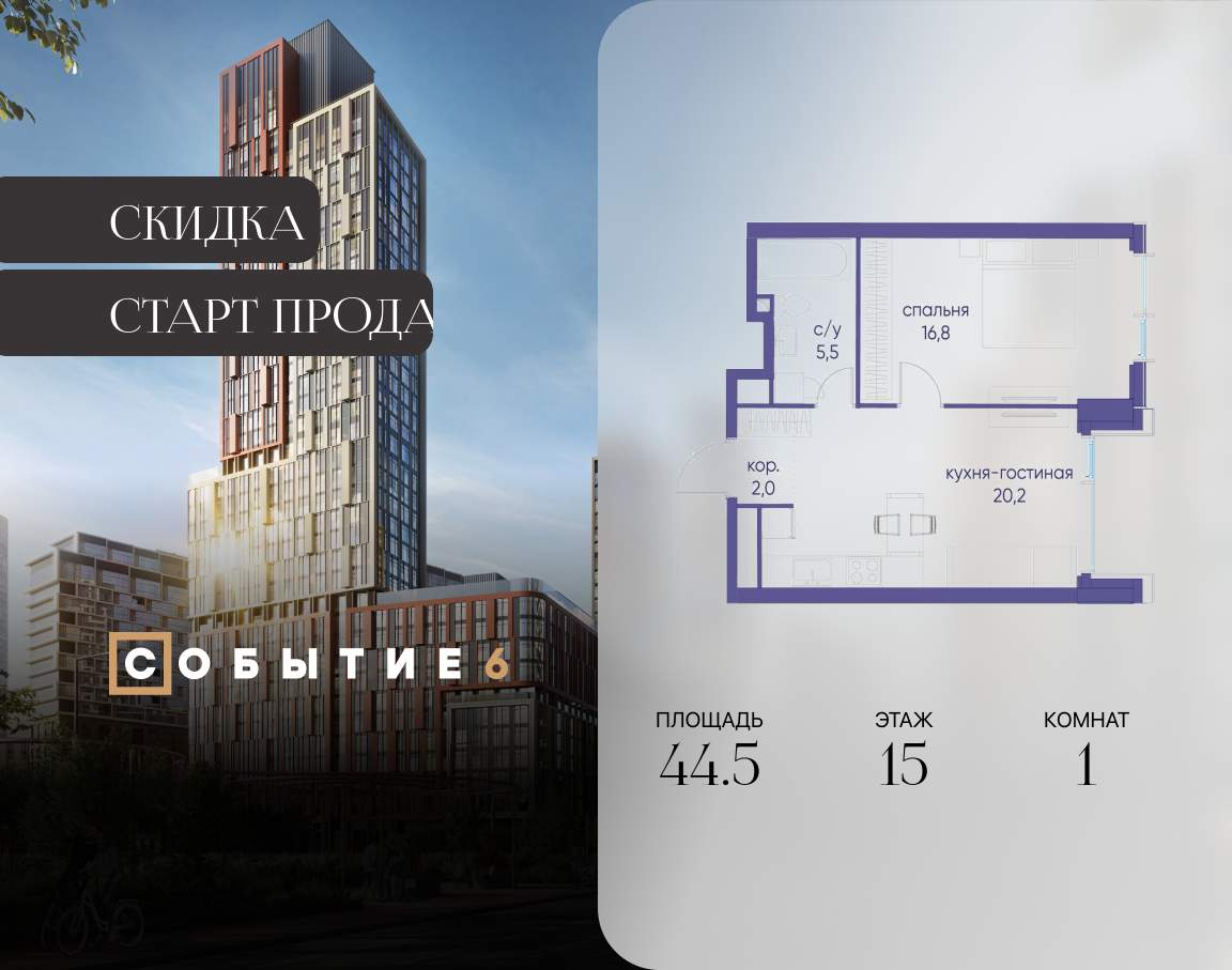 Продаётся 1-комнатная квартира от застройщика: общая площадь 44.50 м, жилая 16.80 м, кухня 20.20 м, 15-й этаж, жилой квартал «Событие-6», корпус 2 (секция 1) Срок сдачи: 1 квартал 2029 года.