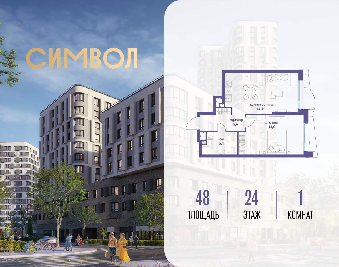 Продается 1-комнатная квартира от застройщика: общая площадь 48.00 м, жилая 14.00 м, кухня 23.30 м, 24-й этаж, жилой квартал «Вдохновение», корпус 35 (секция 1) . Срок сдачи: 4 квартал 2027 года.