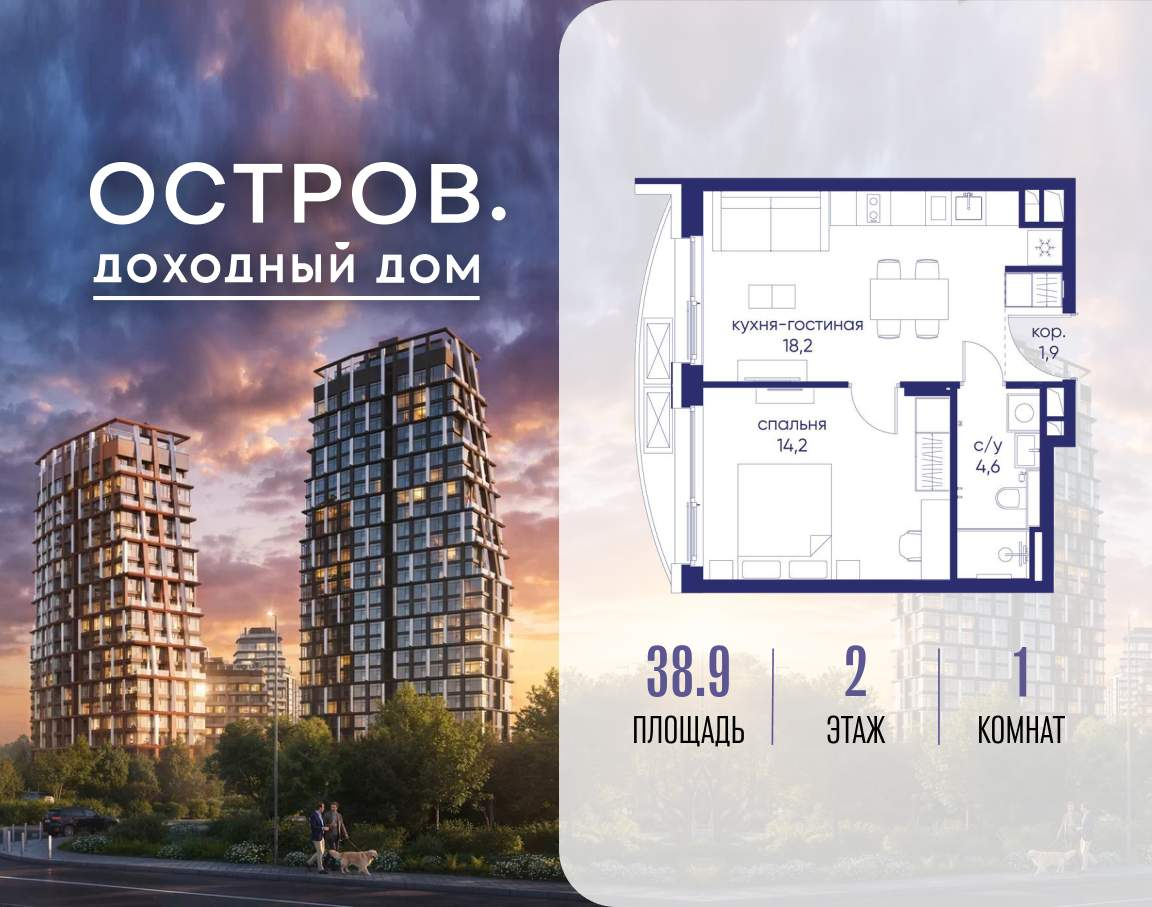 Продаётся 1-комн. квартира от застройщика: общая площадь 38.90 м, жилая 0.00 м, кухня 18.20 м, 2-й этаж, жилой квартал «Остров 14», корпус 1 (секция 1) . Срок сдачи: 2 квартал 2029 года.