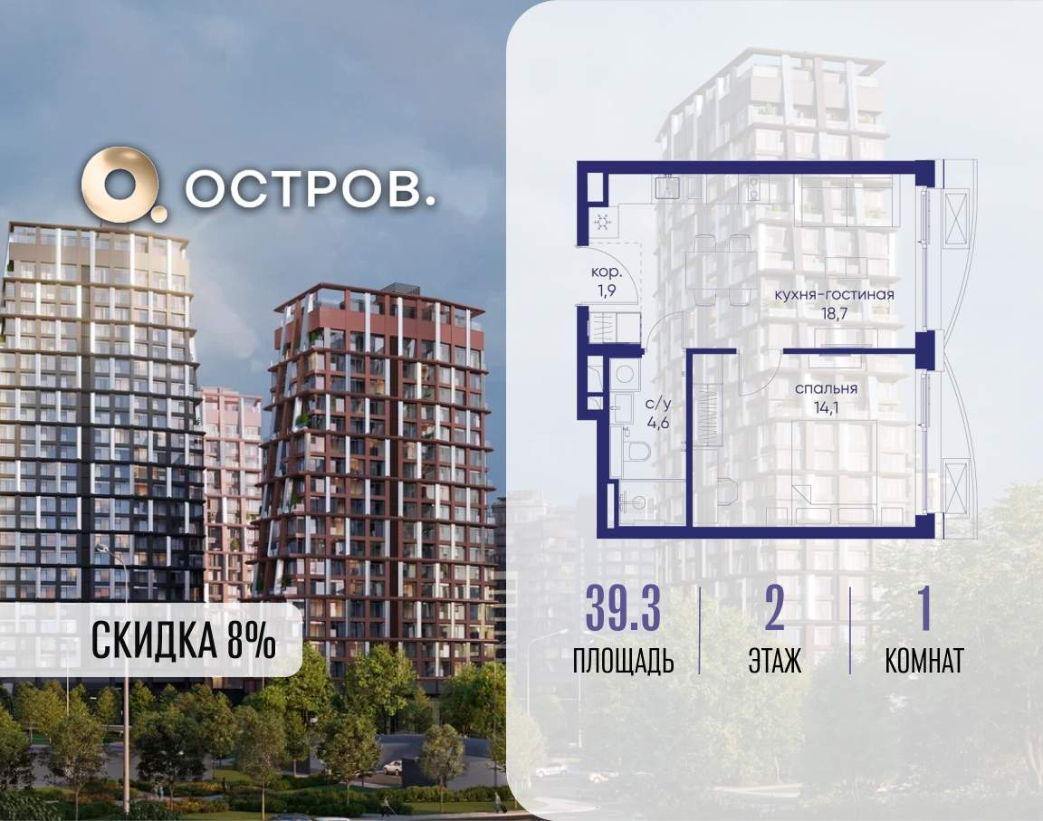 Продаётся 1-комн. квартира от застройщика: общая площадь 39.30 м, жилая 14.10 м, кухня 18.70 м, 2-й этаж, жилой квартал «Остров 14», корпус 1 (секция 1) . Срок сдачи: 2 квартал 2029 года.