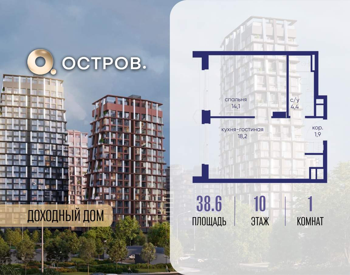 Продаётся 1-комн. квартира от застройщика: общая площадь 38.60 м, жилая 14.10 м, кухня 18.20 м, 10-й этаж, жилой квартал «Остров 14», корпус 1 (секция 2) . Срок сдачи: 2 квартал 2029 года.