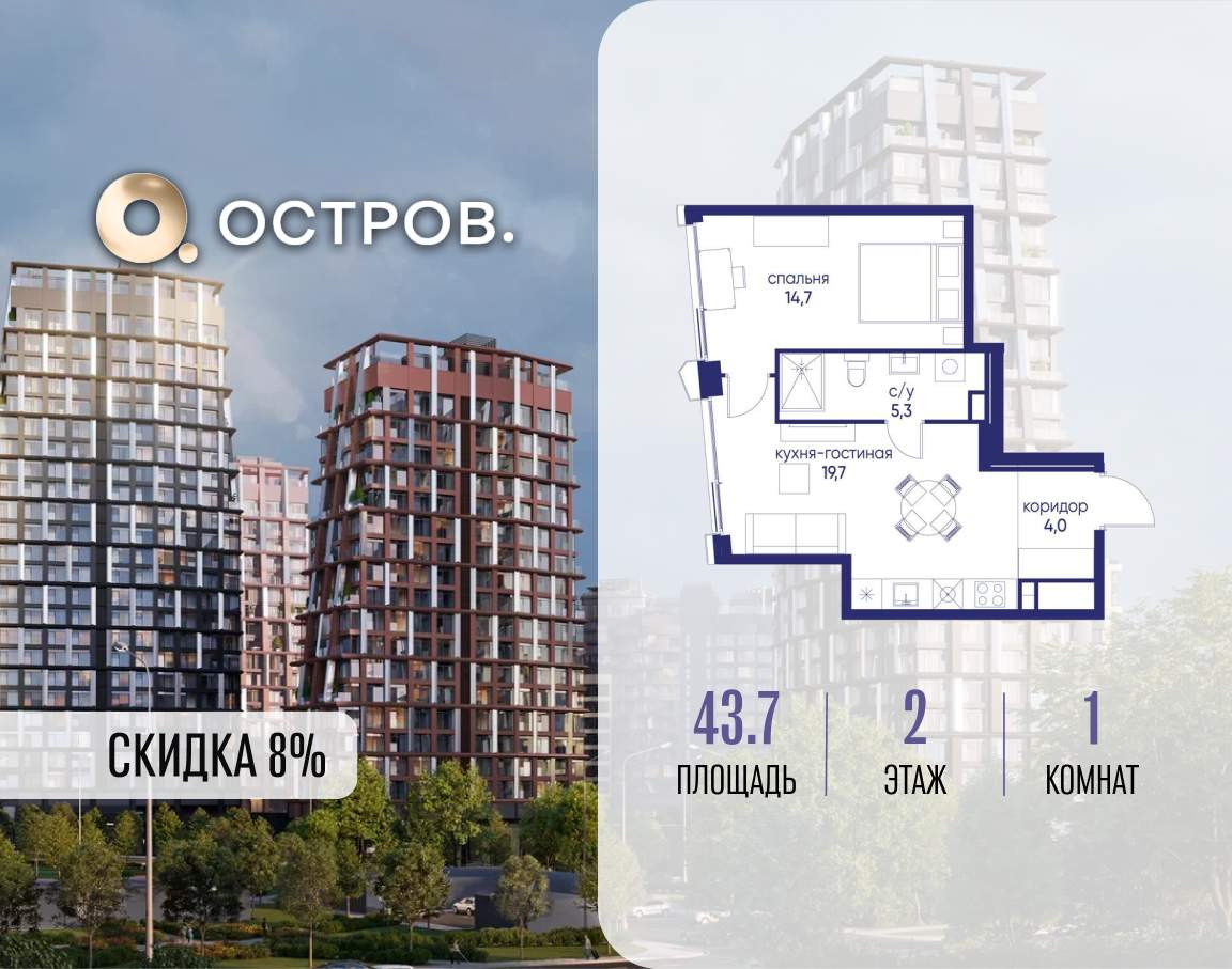 Продаётся 1-комн. квартира от застройщика: общая площадь 43.70 м, жилая 14.70 м, кухня 19.70 м, 2-й этаж, жилой квартал «Остров 14», корпус 4 (секция 1) . Срок сдачи: 2 квартал 2029 года.