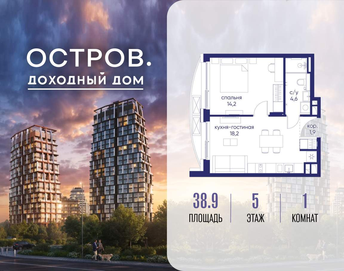 Продаётся 1-комн. квартира от застройщика: общая площадь 38.90 м, жилая 14.20 м, кухня 18.20 м, 5-й этаж, жилой квартал «Остров 14», корпус 1 (секция 1) . Срок сдачи: 2 квартал 2029 года.