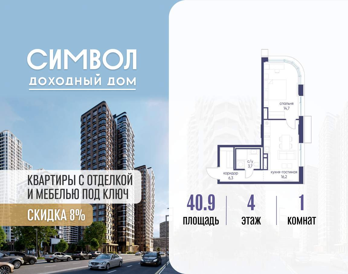 Продается 1-комнатная квартира от застройщика: общая площадь 40.90 м, жилая 14.70 м, кухня 16.20 м, 4-й этаж, жилой квартал «Гордость», корпус 40 (секция 1) . Срок сдачи: 2 квартал 2029 года.