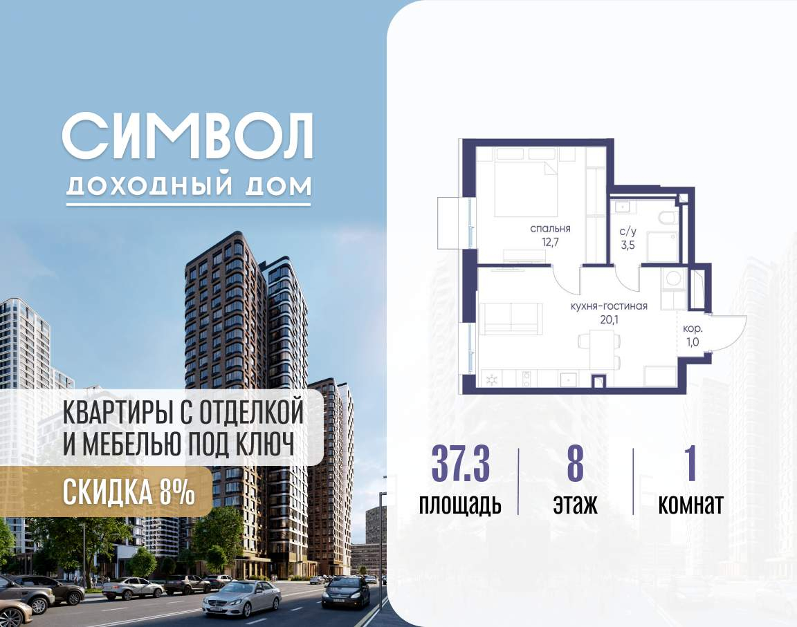 Продается 1-комнатная квартира от застройщика: общая площадь 37.30 м, жилая 12.70 м, кухня 20.10 м, 8-й этаж, жилой квартал «Гордость», корпус 40 (секция 1) . Срок сдачи: 2 квартал 2029 года.