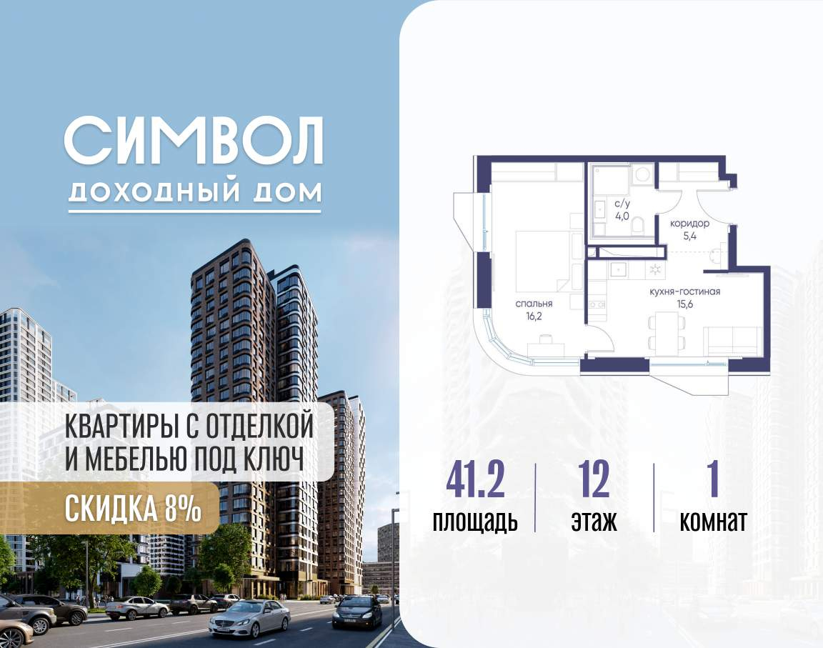 Продается 1-комнатная квартира от застройщика: общая площадь 41.20 м, жилая 16.20 м, кухня 15.60 м, 12-й этаж, жилой квартал «Гордость», корпус 40 (секция 1) . Срок сдачи: 2 квартал 2029 года.