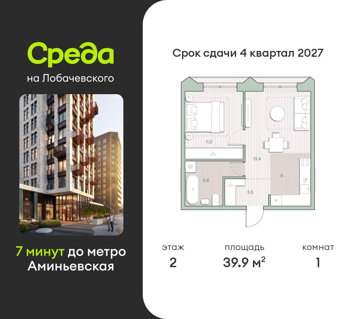 Продаётся 1-комн. квартира от застройщика: общая площадь 47.40 м, жилая м, кухня м, 2-й этаж, жилой квартал «Остров 14», корпус 4 (секция 1) . Срок сдачи: 2 квартал 2029 года.