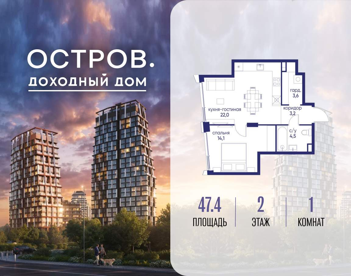 Продаётся 1-комн. квартира от застройщика: общая площадь 47.40 м, жилая 14.10 м, кухня 22.00 м, 2-й этаж, жилой квартал «Остров 14», корпус 4 (секция 1) . Срок сдачи: 2 квартал 2029 года.