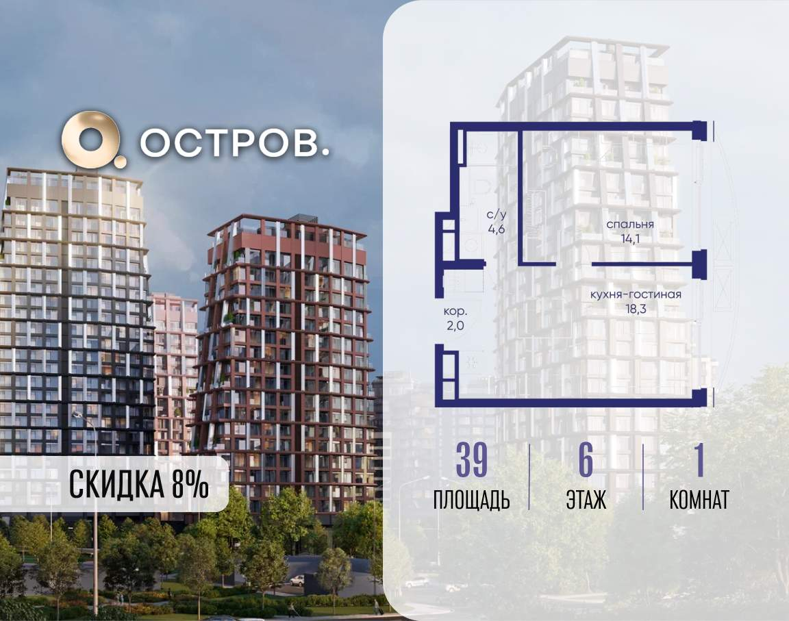 Продаётся 1-комн. квартира от застройщика: общая площадь 39.00 м, жилая 14.10 м, кухня 18.30 м, 6-й этаж, жилой квартал «Остров 14», корпус 1 (секция 1) . Срок сдачи: 2 квартал 2029 года.