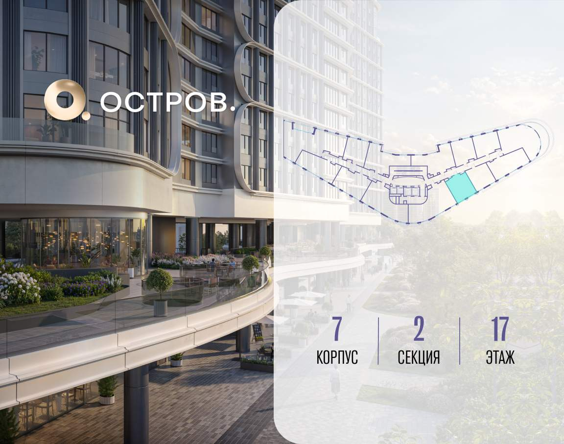 Продаётся 1-комн. квартира от застройщика: общая площадь 50.00 м, жилая 17.50 м, кухня 23.30 м, 17-й этаж, жилой квартал «Остров 7», корпус 7 (секция 2) . Срок сдачи: 3 квартал 2028 года.