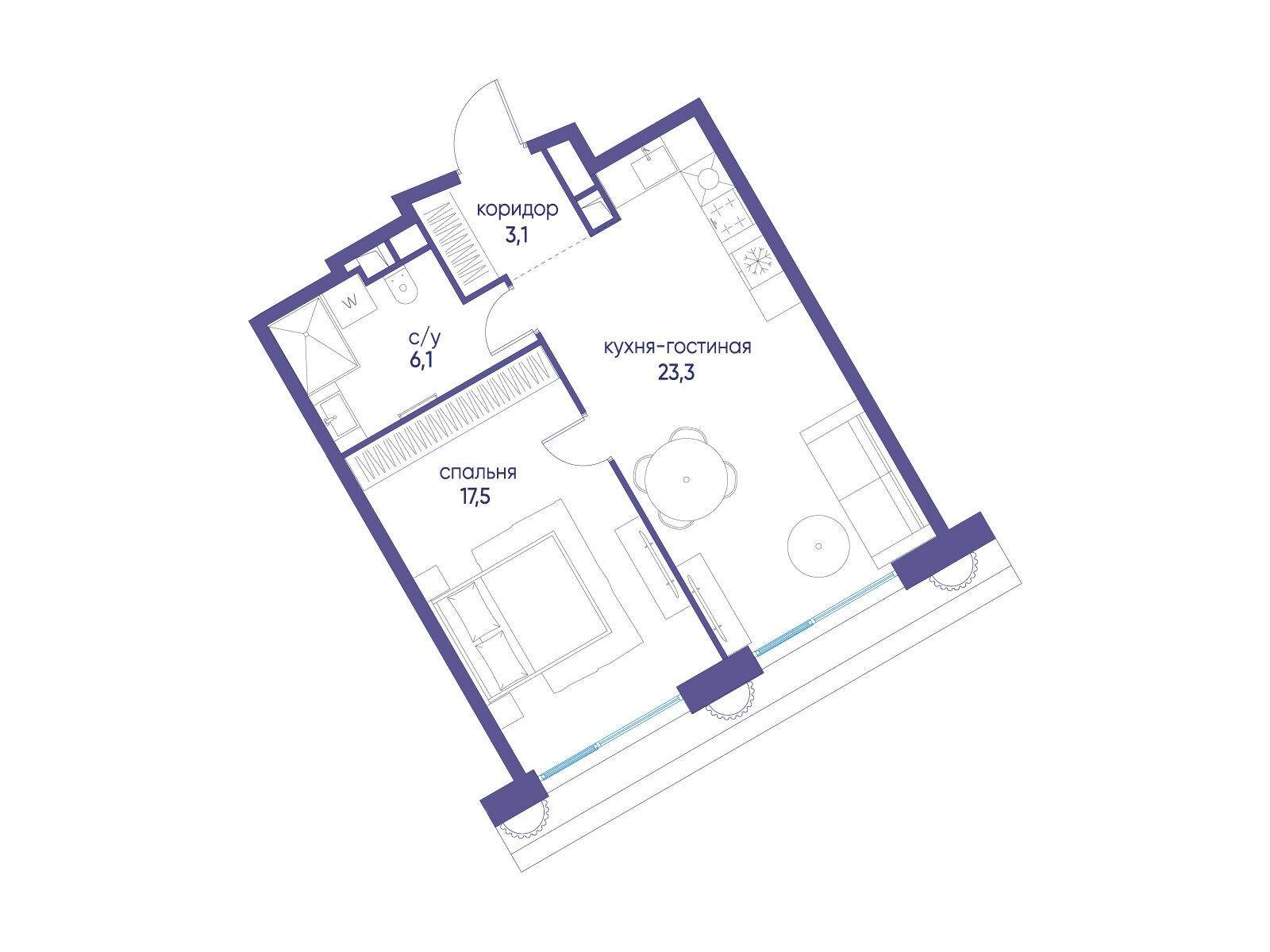 1 совмещенный санузел. В жилой зоне 2 больших окна на одну сторону, хорошая инсоляция.
