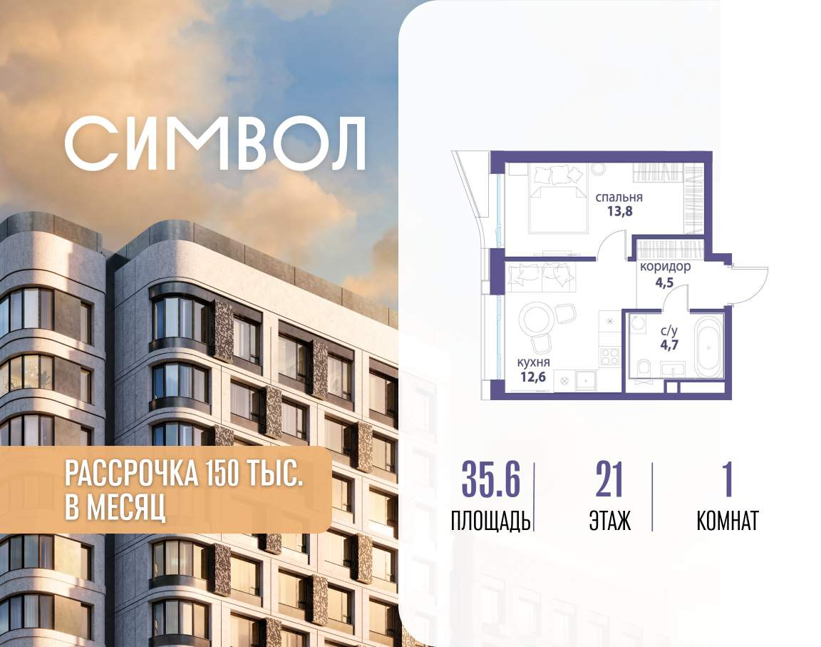 Продается 1-комнатная квартира от застройщика: общая площадь 35.60 м, жилая 13.80 м, кухня 12.60 м, 21-й этаж, жилой квартал «Вдохновение», корпус 33 (секция 3) . Срок сдачи: 4 квартал 2027 года.