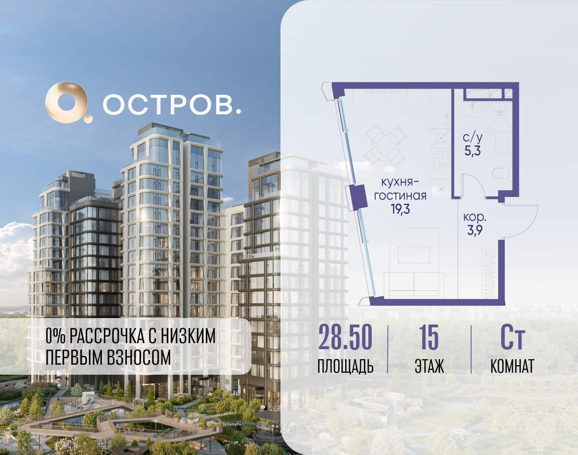 Продаётся квартира от застройщика: общая площадь 28.50 м, жилая 10.00 м, кухня 9.30 м, 15-й этаж, жилой квартал «Остров 12», корпус 3 (секция 1) . Срок сдачи: 1 квартал 2029 года.