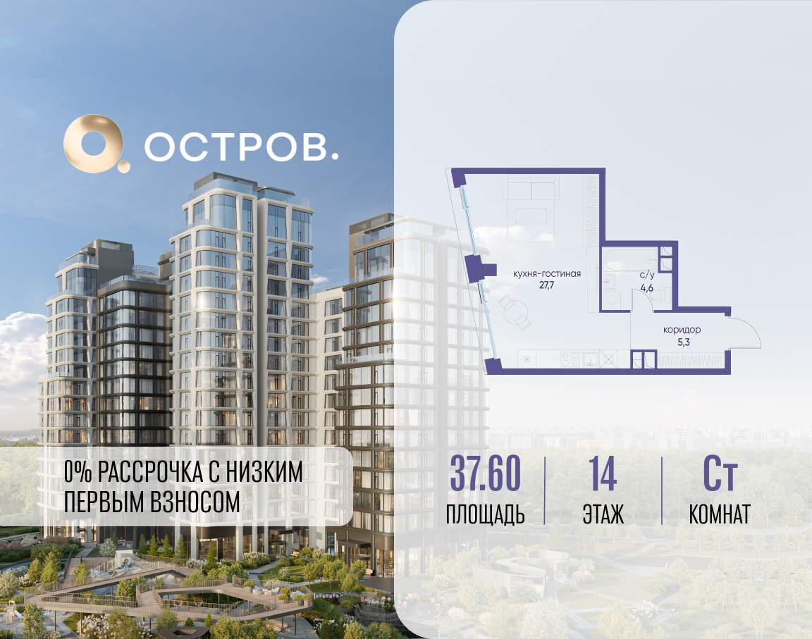 Продаётся квартира от застройщика: общая площадь 37.60 м, жилая 22.70 м, кухня 5.00 м, 14-й этаж, жилой квартал «Остров 12», корпус 1 (секция 2) . Срок сдачи: 1 квартал 2029 года.