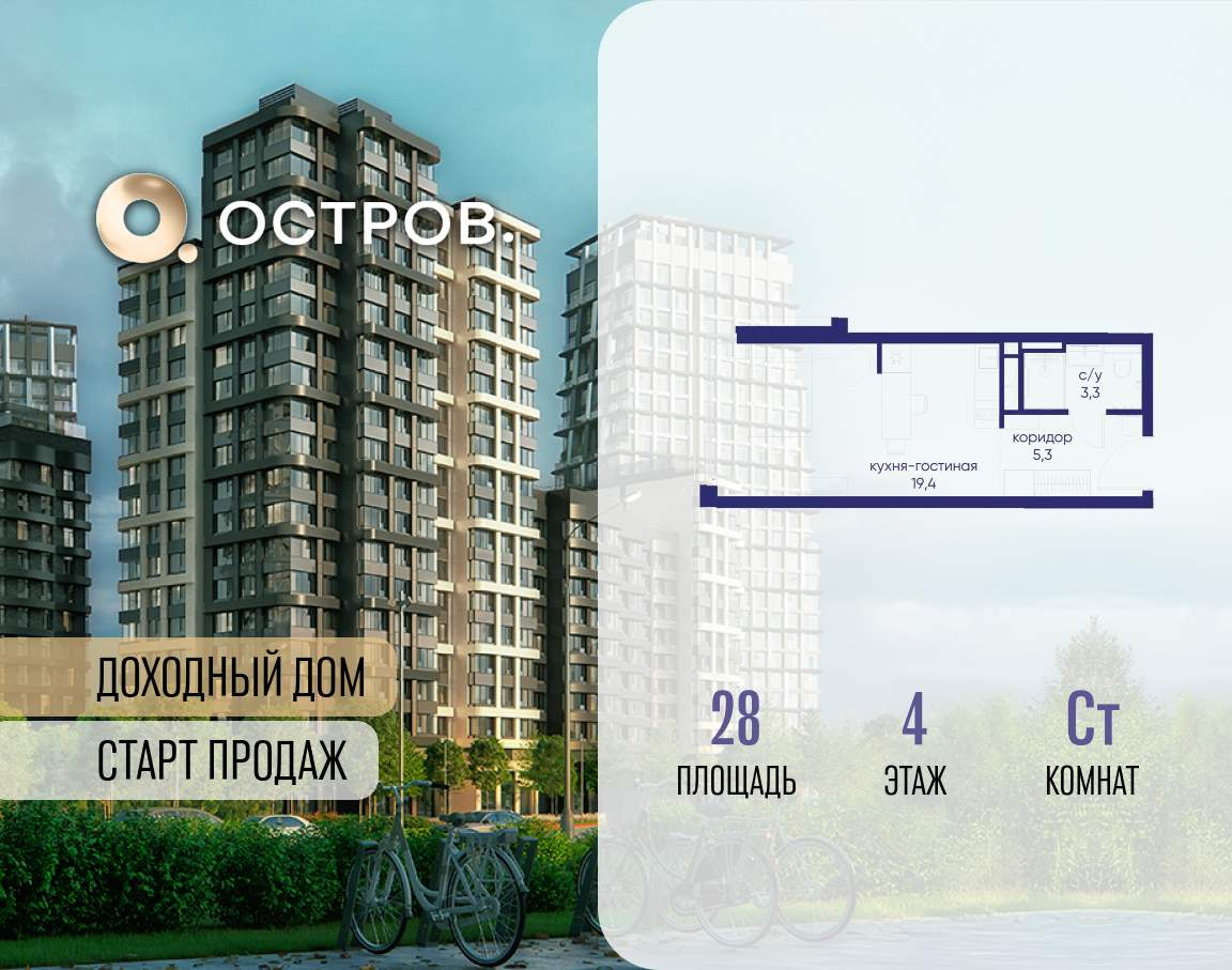Продаётся квартира от застройщика: общая площадь 28.00 м, жилая 14.40 м, кухня 5.00 м, 4-й этаж, жилой квартал «Остров 14», корпус 1 (секция 1) . Срок сдачи: 2 квартал 2029 года.