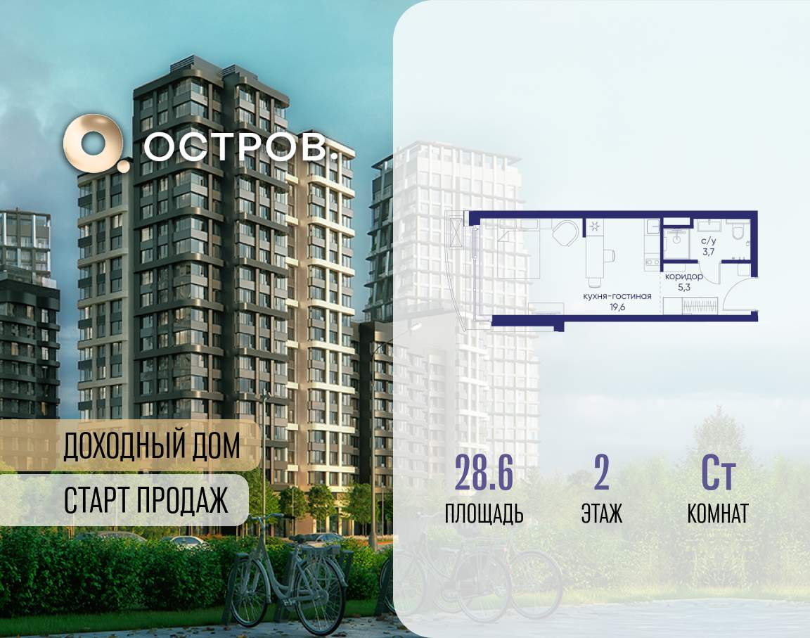 Продаётся квартира от застройщика: общая площадь 28.60 м, жилая 14.60 м, кухня 5.00 м, 2-й этаж, жилой квартал «Остров 14», корпус 1 (секция 1) . Срок сдачи: 2 квартал 2029 года.
