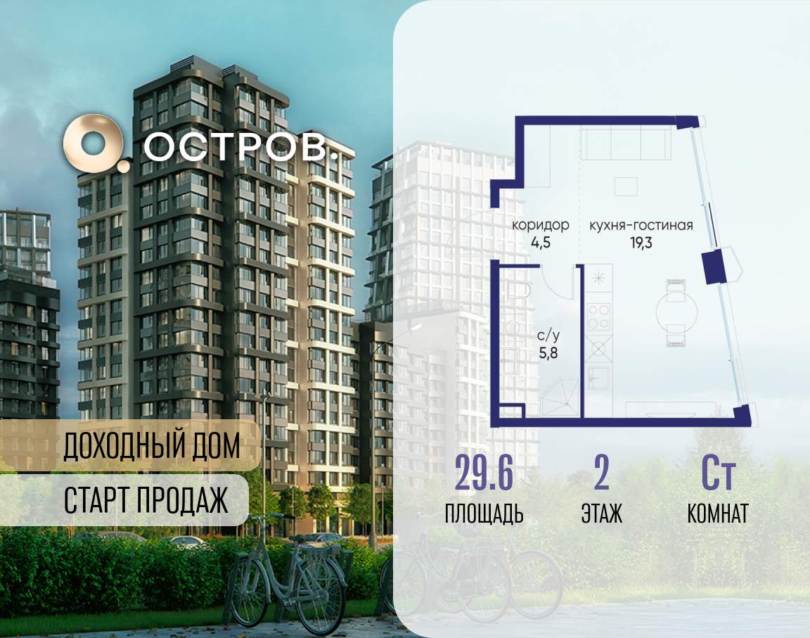 Продаётся квартира от застройщика: общая площадь 29.60 м, жилая 14.30 м, кухня 5.00 м, 2-й этаж, жилой квартал «Остров 14», корпус 6 (секция 1) . Срок сдачи: 2 квартал 2029 года.