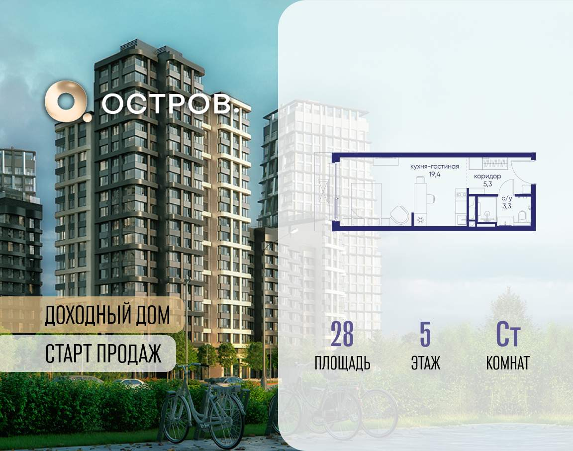 Продаётся квартира от застройщика: общая площадь 28.00 м, жилая 14.40 м, кухня 5.00 м, 5-й этаж, жилой квартал «Остров 14», корпус 1 (секция 1) . Срок сдачи: 2 квартал 2029 года.