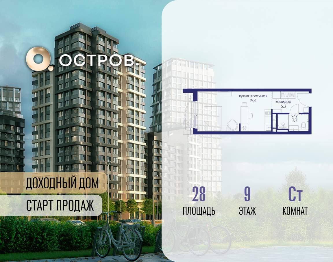 Продаётся квартира от застройщика: общая площадь 28.00 м, жилая 14.00 м, кухня 5.00 м, 9-й этаж, жилой квартал «Остров 14», корпус 1 (секция 2) . Срок сдачи: 2 квартал 2029 года.