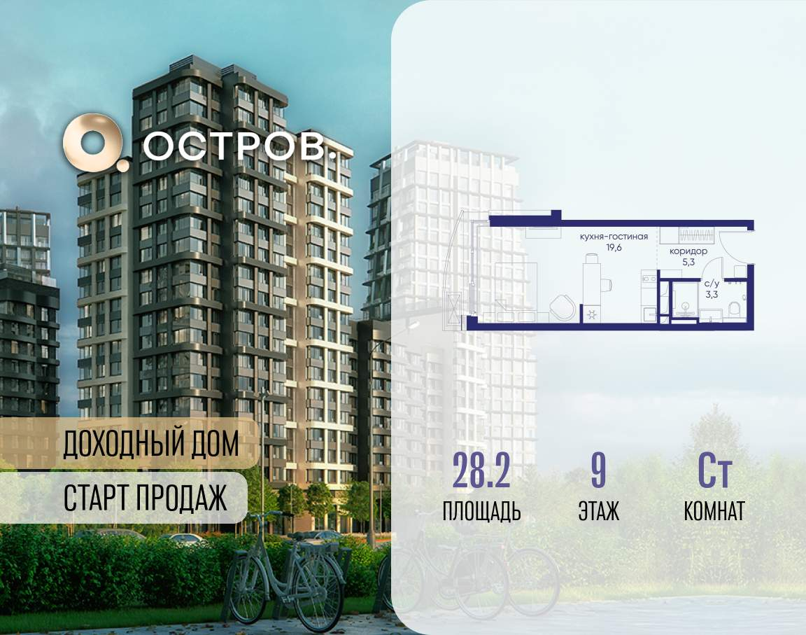 Продаётся квартира от застройщика: общая площадь 28.20 м, жилая 14.60 м, кухня 5.00 м, 9-й этаж, жилой квартал «Остров 14», корпус 1 (секция 1) . Срок сдачи: 2 квартал 2029 года.
