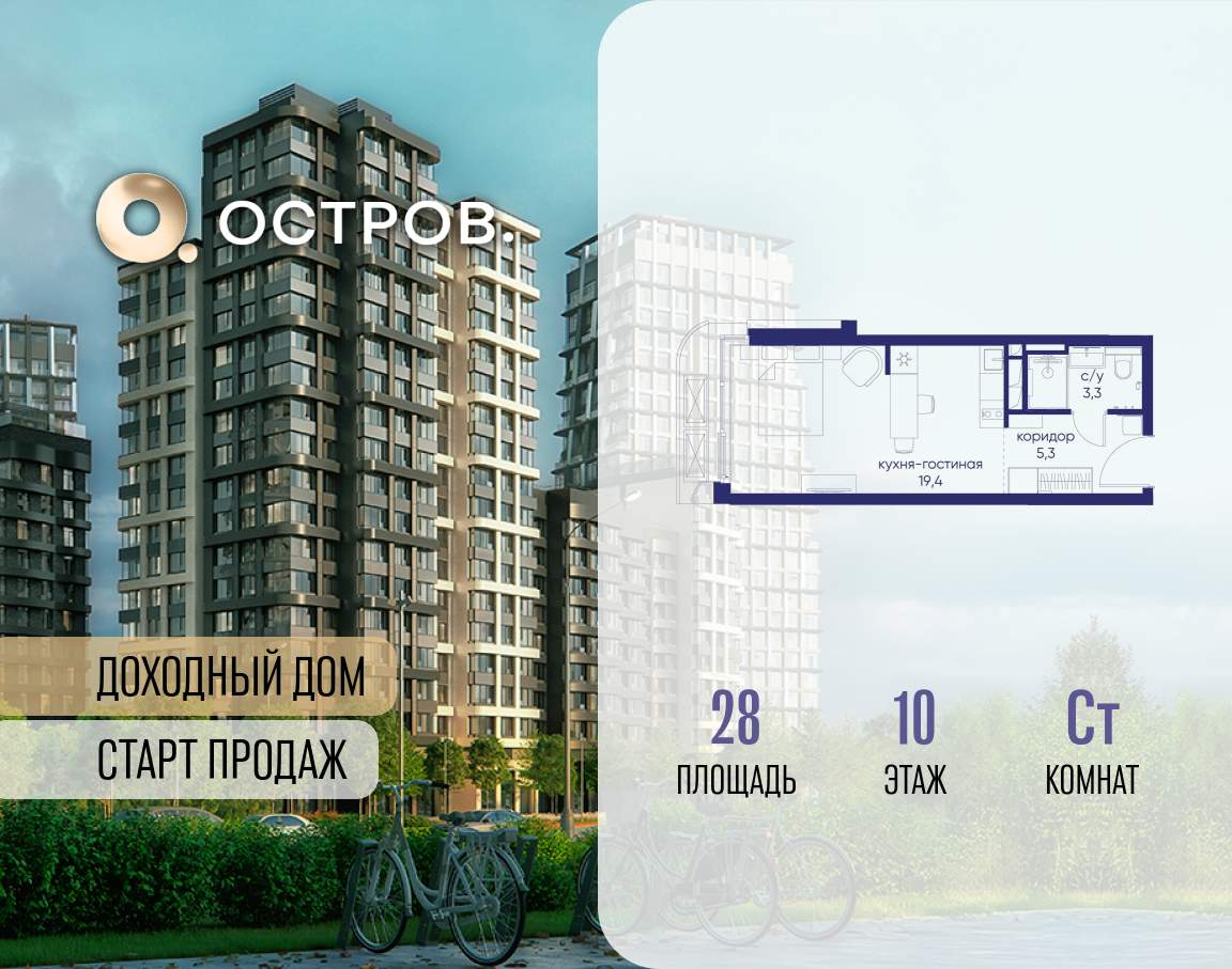 Продаётся квартира от застройщика: общая площадь 28.00 м, жилая 14.40 м, кухня 5.00 м, 10-й этаж, жилой квартал «Остров 14», корпус 1 (секция 1) . Срок сдачи: 2 квартал 2029 года.